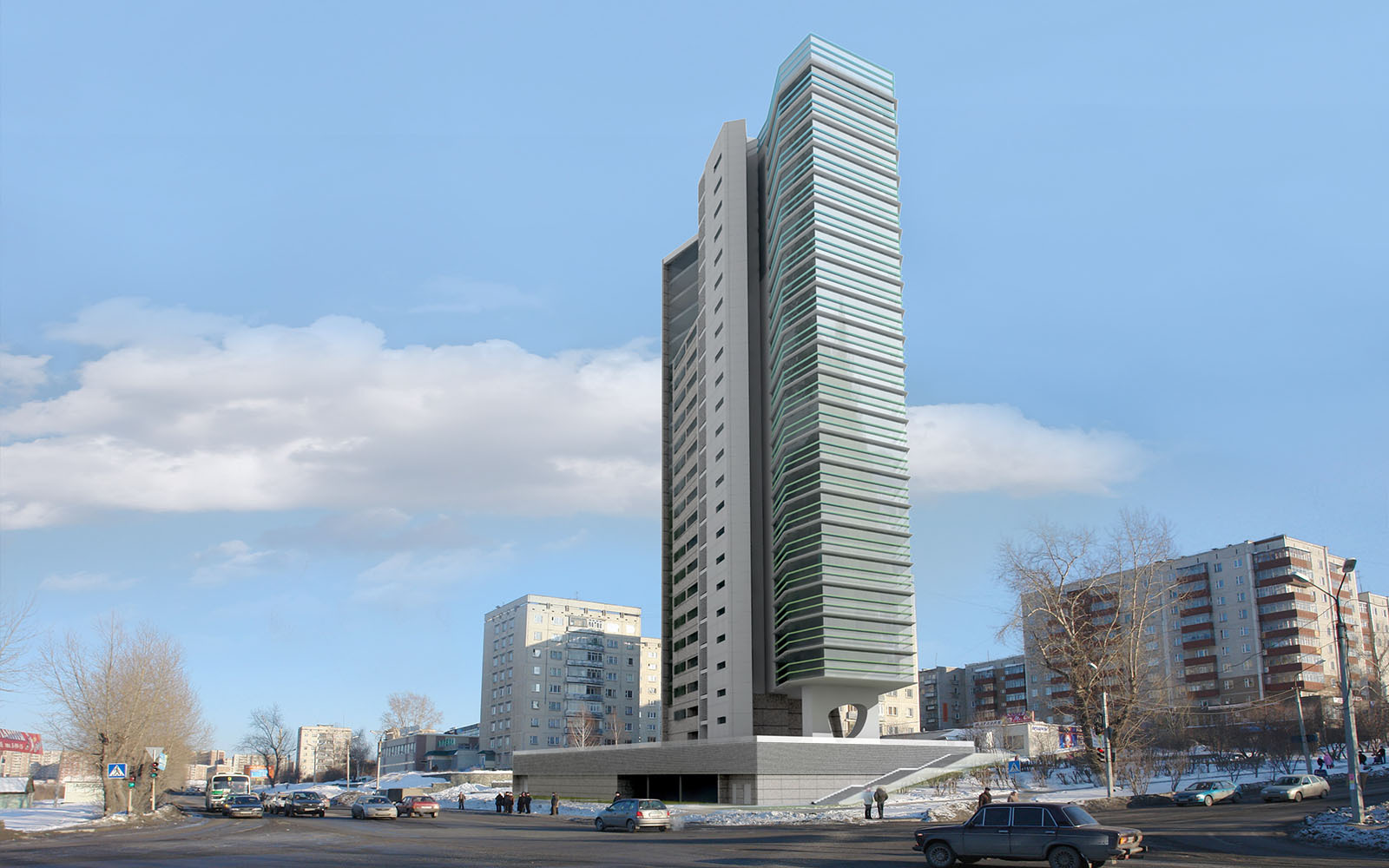 Планировочное решение жилого дома представляет собой одну 23 - этажную секцию, имеющую под собой общий стилобат. В нем размещены механизированные 2-х уровневые паркинги. Здание делится на офисную (с 1 по 2 и с 21 по 23 этажи) и жилую зону (с 3 по 20 этажи). Квартиры дома имеют разные планировочные решения. В основе конструктивной схемы жилого дома лежит монолитный железобетонный каркас. Зрительно здание разделено на два обьема: главный, решенный в стекле и второстепенный, облицованный гранитом. Главной фасадной системой является конструкция ограждения лоджий квартир, которая выполняется по принципу витражного остекления.