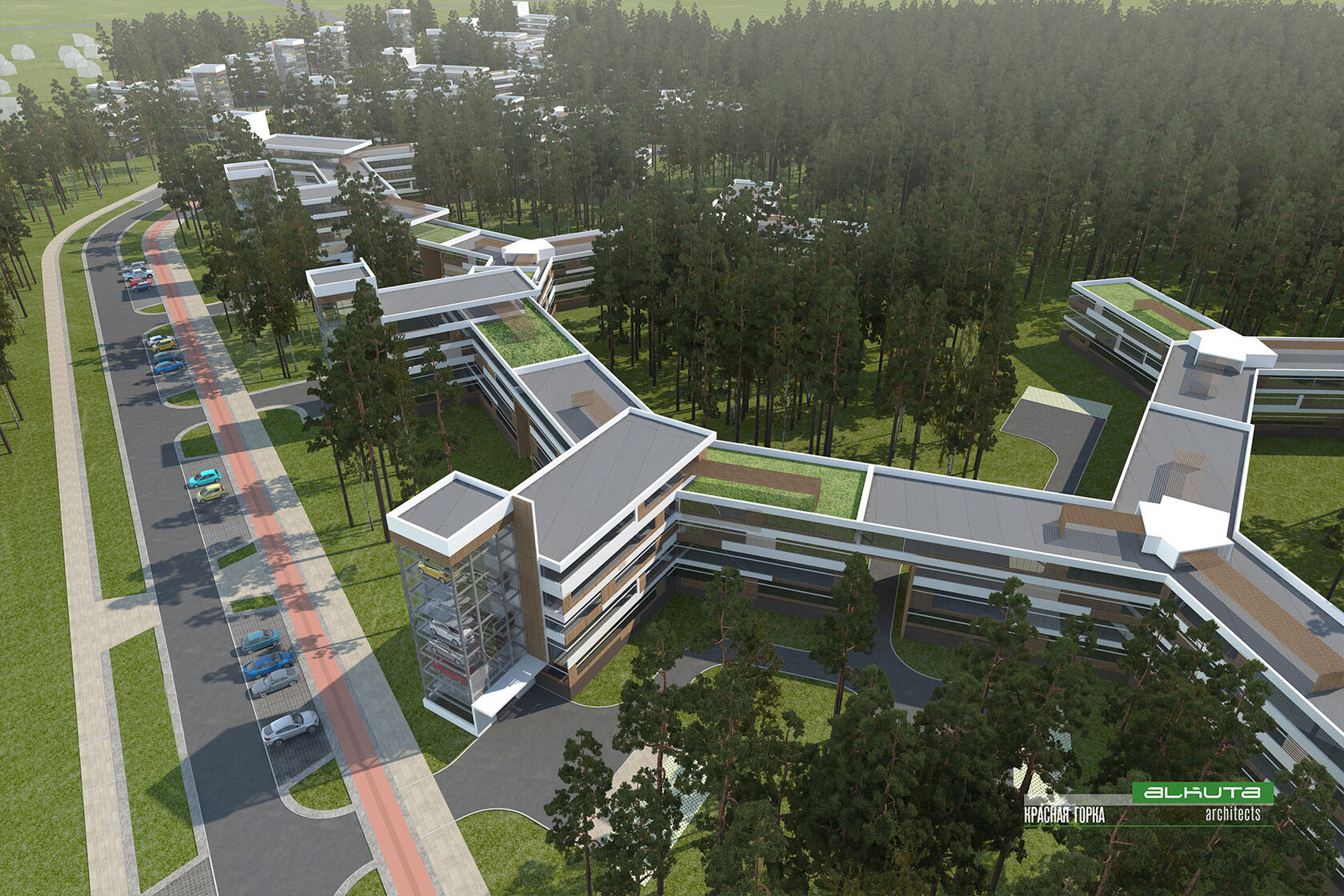 Данным проектом предусмотрена застройка многоквартирными домами и объектами социального и общественного значения с учетом комплекса мероприятий по «зеленому» строительству — энергоэффективности, экологичности и безопасности. Такое так называемое «зеленое» строительство позволяет сохранить существенную зону зеленых насаждений. Вся жилая застройка расположена вдоль транспортных путей, но спроектирована таким образом, что многоквартирные секционные дома образуют вдоль улиц зеленые курдонеры, позволяя парковым насаждениям перетекать во дворы и далее к дорогам. 3-5 этажная застройка формируется так, чтобы секции домов располагались вдоль проезжей части улиц и ступеньками спускались в лесной массив. Формирование такой средне этажной застройки и обеспечивает сохранение насаждений по периметру земельного участка.Особенностью проекта «Красная Горка», помимо всего прочего, являются благоустроенные парковые территории, которые гармонично перетекают на свободные от застройки участки дворов с пешеходными и велосипедными дорожками. Проходы между домами служат входами на благоустроенную лесопарковую зону. Доступ личного транспорта на территорию парка запрещен и ограничивается основными улицами и проездами внутри курдонеров. Для автотранспорта проектом предусмотрены механизированные многоуровневые паркинги.