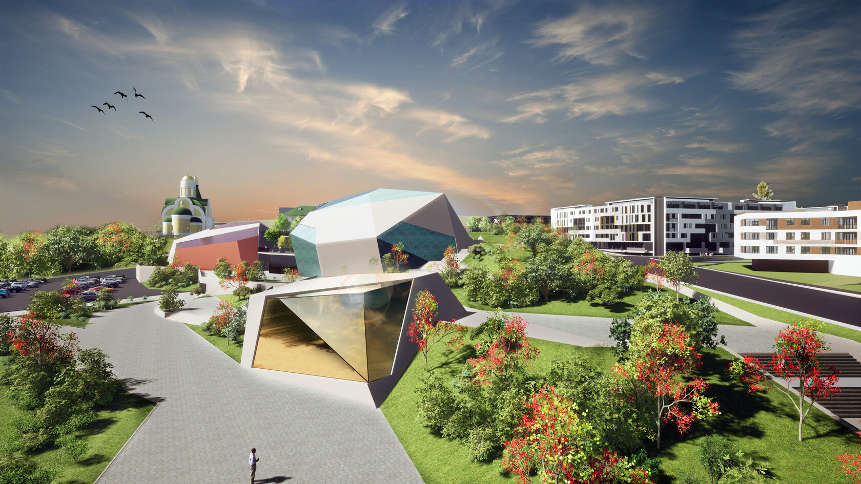 За основу Концепции музея "Медный" мы взяли кристаллы меди, расположив их на сложном рельефе с перепадом 18 метров