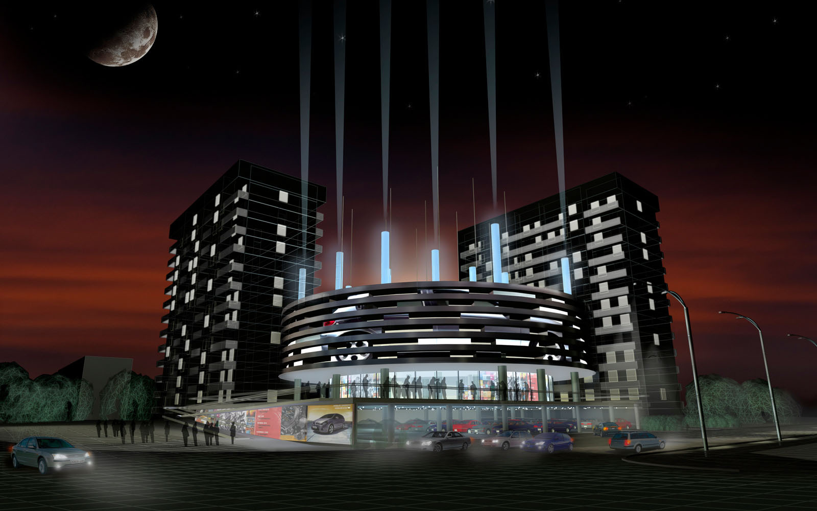 Это был инновационный проект для того времени. Функционально мы рассматривали его как молодежный центр. Ночные клубы и дискотеки располагались в то время, как правило, в переоборудованных помещениях, либо в кафе, барах и ресторанах. Планировалось, что новое здание будет иметь новую универсальную функцию, новые технологии и новую форму. Начнем с формы - круглый двухэтажный диск, зависший над плоскостью стилобата - это абсолютно новая конфигурация здания для Первоуральска. То, что это наиболее выразительная форма, подтверждается внешним обликом Инновационного Культурного Центра, построенного недавно в Первоуральске. Новые для того времени технологии, выражались в РЕКУПЕРАЦИИ, КОМПЬЮТЕРИЗАЦИИ, МЕДИА ФАСАДЕ, СВЕТОДИОДНОМ и ЛАЗЕРНОМ оснащении комплекса. Все эти новшества стали очевидной необходимостью для зданий такого типа сегодня. Истинной целью заказчика, как выяснилось позже, было капитализировать участок и продать землю.