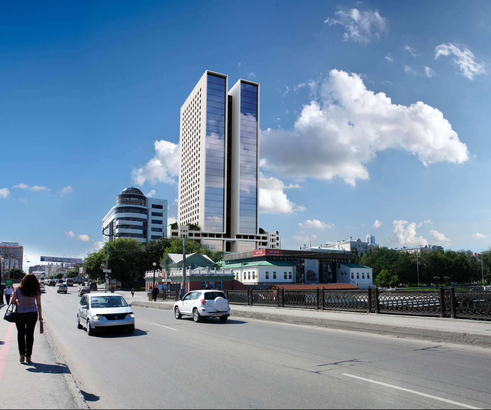 комплексная застройка предствлена в границах улиц Маышева - Добролюбова - Радищева - Шейнкмана: ЖК "Форум Сити", ЖК "Аквамарин", ЖК "Кольцо Екатерины", а также в квартале Ленина-Хохрякова-Попова-Шейнкмана. Здания-небоскребы высотой 100 м и более образуют своего рода кольцо вокруг исторического ядра центра и даже заходят в него - утвержден проект и готовится площадка под строительство 30-этажной гостиницы "Радиус-2" по ул. Малышева/ 8 Марта. Изменения, происходящие в облике центральной части города, дают основание включить новый высотный объект в историческую среду путем дополнения и развития существующего комплекса "Дом обороны". Архитектурное решение комплекса продиктовано стилистикой существующего здания по улице Воеводина,6. Екатеринбург славится постройками в стиле «конструктивизм», поэтому на участке, выбранном для размещения нового многофункционального комплекса, невозможно не использовать стилистику комплекса "Дом обороны" начала XX го века. Более того, благодаря ему архитектура нового комплекса получает новое звучание, наполненное простыми и чистыми формами конструктивизма, представленными в современном прочтении. Такое решение покажет преемственность в развитии эстетики городской ткани, и выделит объект в сравнении с современной трактовкой архитектуры высотных зданий. Высотный объем комплекса вырастает над существующим шестиэтажным зданием. За ним в