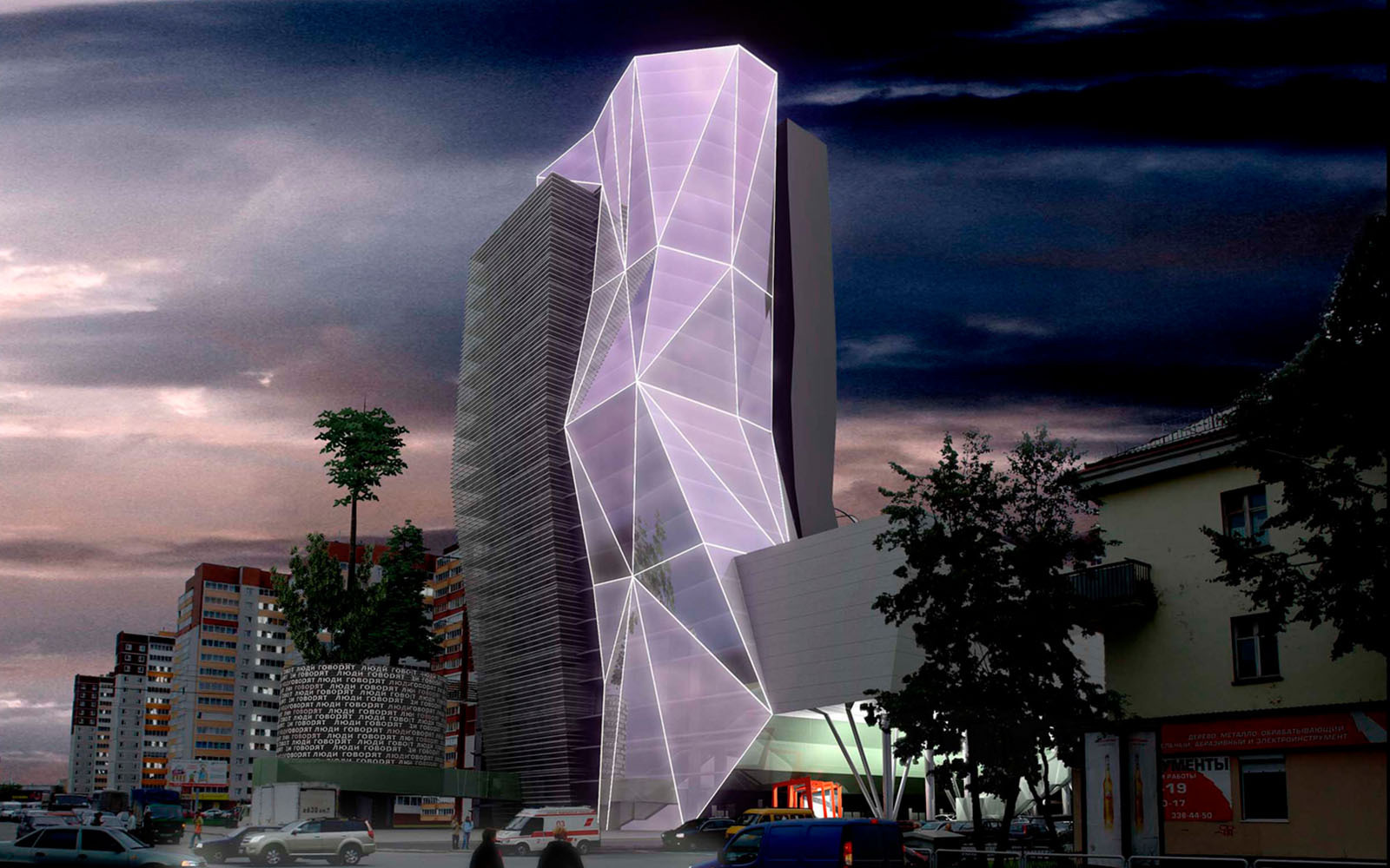 К высотной части здания примыкают два блока механизированных автомобильных паркингов. На кровле круглой парковки расположен небольшой сквер, а стены являются рекламно-информационным пространством с технологией медиа-фасада. Сложная многогранная стеклянная конструкция офисной части напоминает форму кристалла. Сиреневый цвет придает фасаду особый смысл, он олицетворяет уральский аметист. Поиск единства разнообразия формы и многофункциональности внутреннего пространства вылился в яркий запоминающийся образ, который должен был акцентировать небольшую площадь на перекрестке улиц Сулимова и Учителей в городе Екатеринбурге. Проект, к сожалению, остался не реализованным, но работа над ним показала, какие возможности имеют современные фасадные системы и технологии.