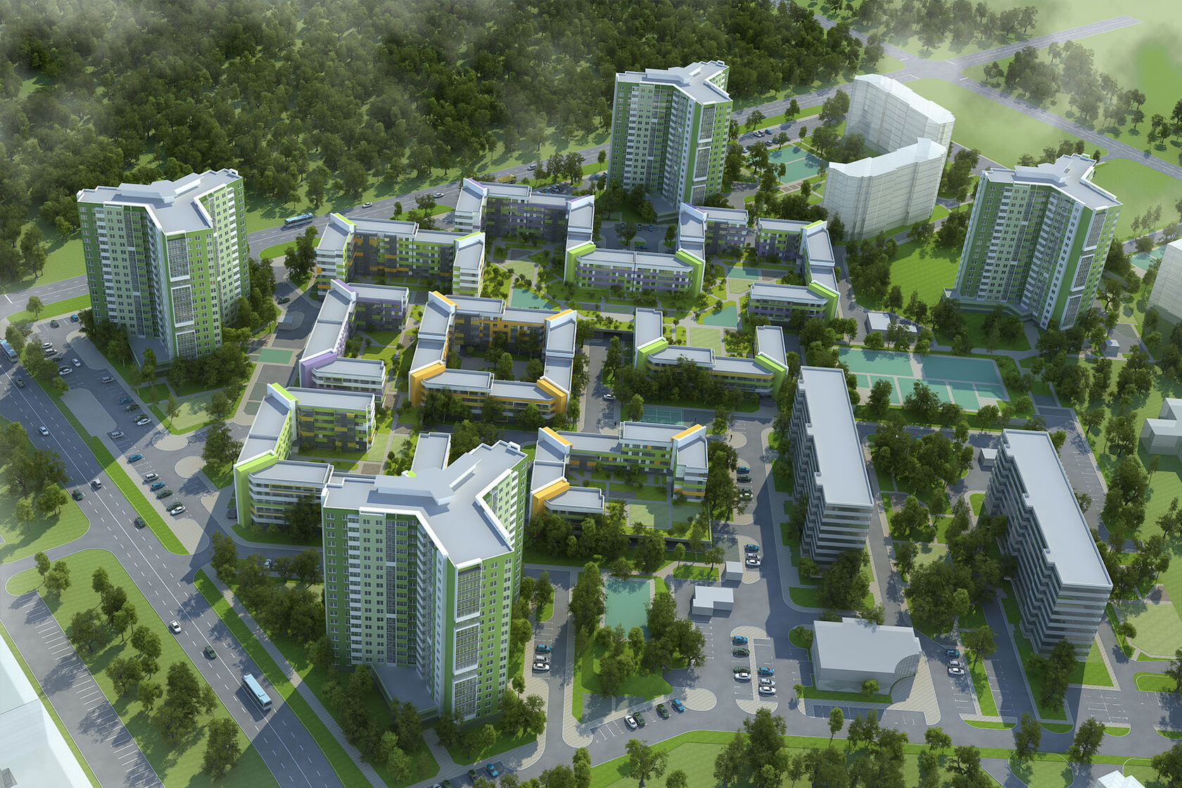 Архитектурно-планировочное решение района формирует новую селитебную зону, основанную на взаимодействии плотной среднеэтажной застройки и высотных акцентов - 16-этажных домов башенного типа - трилистников. Данное планировочное решение подчеркивает использование двух типов жилой застройки: массовый и повышенной комфортности. Центральная часть застройки района представлена трех-семиэтажными жилыми домами с квартирами повышенного уровня комфортности. Высотные жилые дома акцентируют угловые точки застройки. Застройка микрорайона формирует ул. Машиностроителей и ул. Гороховую. Пересечение улиц Гороховая и Машиностроителей акцентировано высотным 16-этажным домом с помещениями общественного назначения. Застройка массового типа – это секционные 9-ти и 16-этажные жилые дома со встроенными общественно-административными помещениями. В жилом 16-этажном доме, расположенном с юго-восточной стороны размещен встроенно-пристроенный детский сад на 150 мест. В сегменте жилья массового типа проектом предусматриваются одно-, двух- и трехкомнатные квартиры. В сегменте жилья повышенной комфортности предусмотрены трех- и четырехкомнатные двухуровневые и одно-, двух- и трехкомнатные одноуровневые квартиры. Жилые дома повышенной комфортности, расположенные в центральной части района, объединены стилобатом, который формирует систему безопасных перетекающих дворовых пространств с озеленением и благоустройством на уровне второго этажа. Хранение личных автомобилей будет осуществляться на открытых площадках, под стилобатами, а так же в многоуровневых обвалованных паркингах, расположенных в границах отведенного участка.